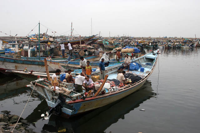 Fish harbor at the edge of Al-Hudayda town. Traditional dhow boats (arabic sailboats) are very colorful. Yemen.